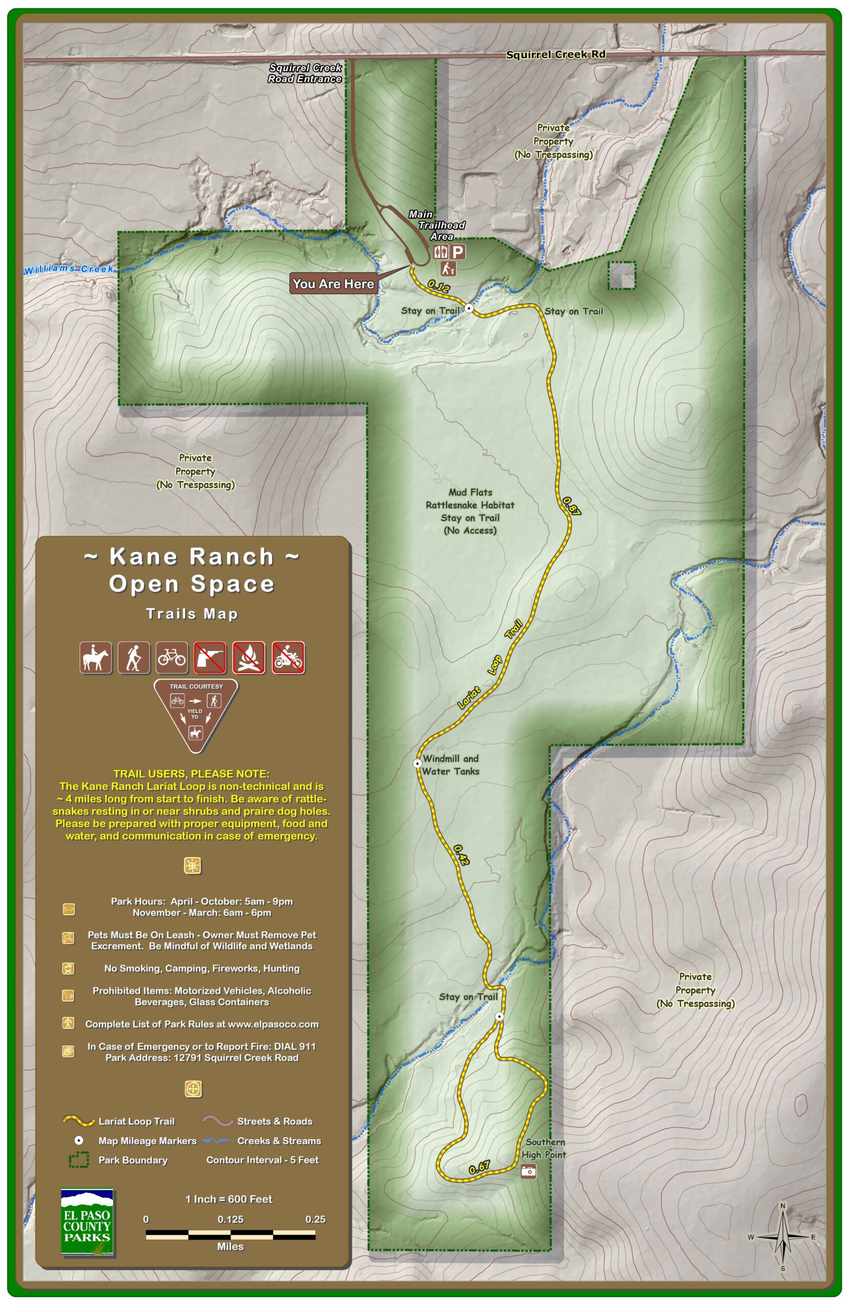 The open space, located 4 miles east of Fountain on Squirrel Creek Road was acquired by El Paso County in 2003. It offers expansive views of native grasslands, pockets of cottonwood trees, and unique vies of Pikes Peak and Cheyenne Mountain. The open space features the Lariat Loop Trail, a 3.5 mile long double-track natural surface trail, suitable for hiking, running, bicycling, and especially equestrian since the trail allows for riding side by side. Additional trails are planned for the property and will provide future recreational opportunities with the open space.